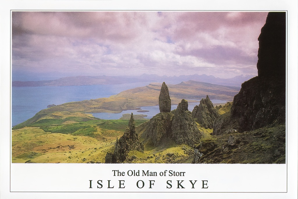 Skye’s most majestic geological features are the Old Man of Storr, the Quiraing and the Cuillin. On the postcard is the Old Man of Storr, which is a large pinnacle of rock that stands high and can be seen for miles around. As part of the Trotternish ridge the Storr was created by a massive ancient land-side, leaving one of the most photographed landscapes in the world. This astonishing view is worth to go on the list to visit it one day.