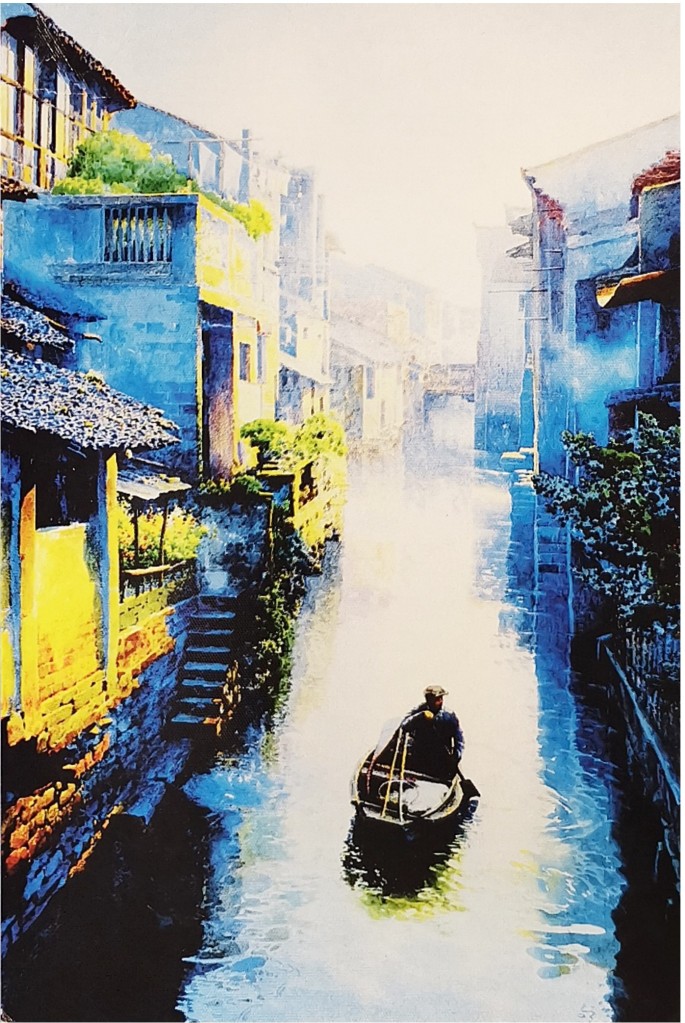 The Yingying postcard is a replica of a canvas painting, which is actually an idyllic scene on the Yangtze River, a small town next to the river. It is the largest river in China.