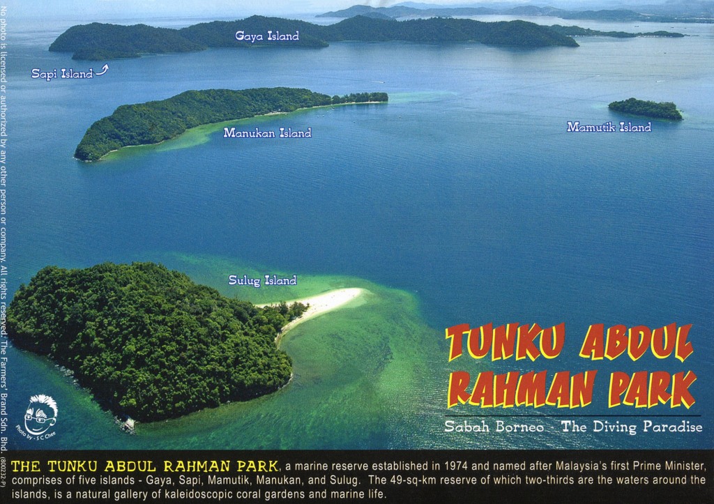 Additional info – On the postcard is written that The Tunku Abdul Rahman Park (named after the first Malaysian prime minister) is composed of five Islands – Gaya, Sapi, Mamutik, Manukan and Sulug. It’s actually a marine reserve, with a natural gallery of kaleidoscopic coral gardens and marine life.