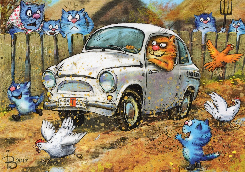 I am so happy that I had the chance to choose this postcard by myself. It’s so lovely and I started to be a fan of Rina Zeniuk’s blue cat postcards. She did an amazing job. There is only one thing, I might name this postcard Cat in a Ficho, or Ficho Foreman 😂 (in Macedonia this type of car is called Ficho 🤗).