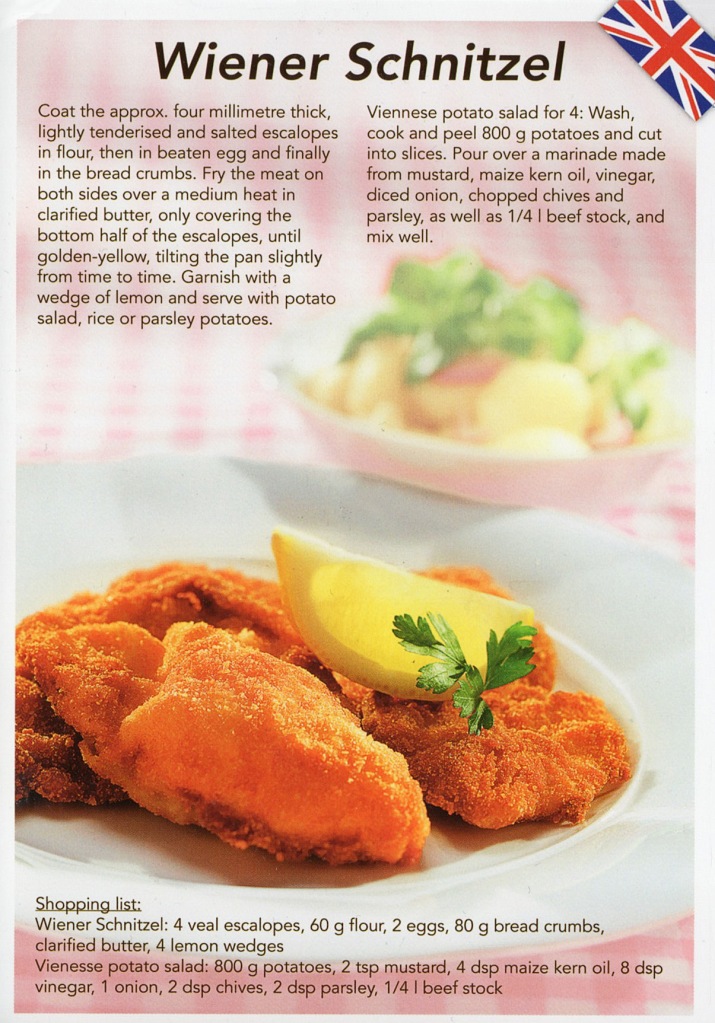 When you to go Vienna, you have to try wiener schnitzel, otherwise it would be like you never been there. I have tried, homemade and i know what i am talking about. Here is the traditional recipe, on postcard, send by dear friend Martina (my namesake 🙂 ) who is from Germany actually, but whenever she travels around she is sending me postcards. Of course she recommend this delicious meal as well, but till then you can try at home.